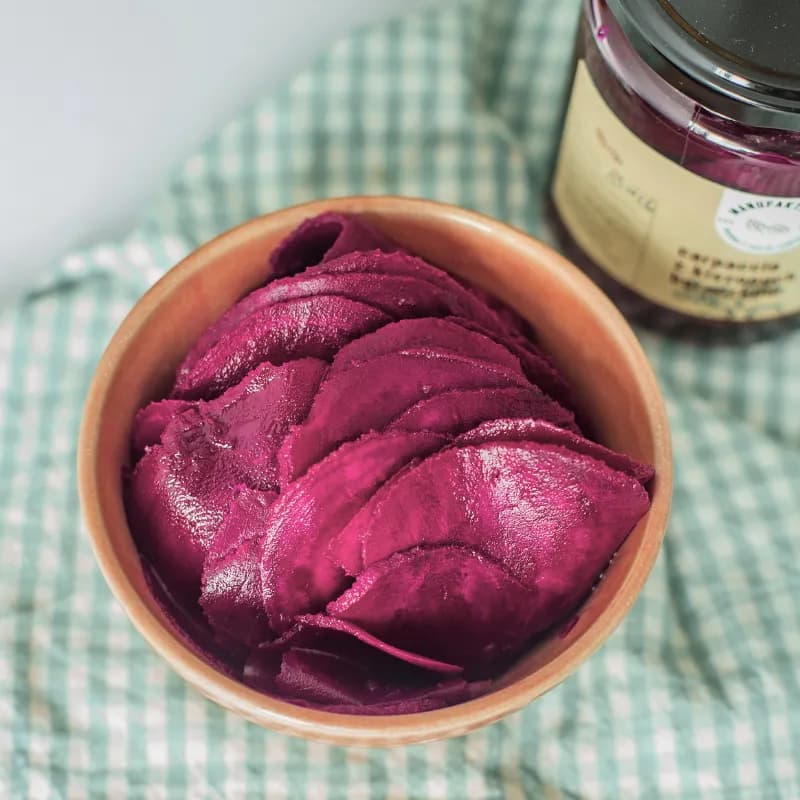 Buraczki w plasterkach kiszone naturalnie z kłodawską solą kamienną, czosnkiem, chrzanem i koprem. Produkt niepasteryzowany.