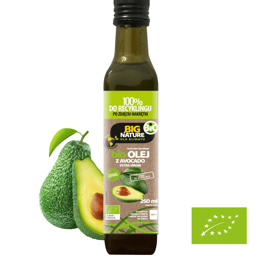 Ekologiczny olej z awokado extra virgin otrzymywany przez tłoczenie na zimno i filtrację. Tłoczony na zimno organiczny olej z awokado posiada zielonkawy kolor, lekki orzechowy smak i zapach świeżego miąższu owocowego. Ze względu na swój wspaniały kolor i właściwości jest powszechnie używany jako cenny dodatek do sałatek i wielu innych potraw. Przyjmuje się, że nawet jedna trzecia uprawianych owoców awokado jest wykorzystywana do wyrobu oleju.