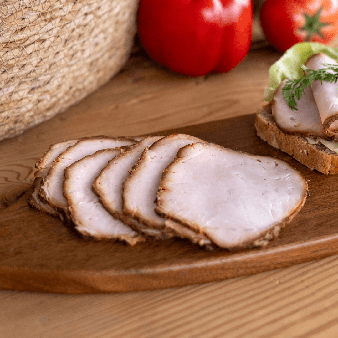 Polędwica bez dodatków - tz. "E". Również bez soli peklującej zawierającej azotyn sodu - wyłącznie sól kuchenna. Polędwica wędzona na naturalnym drewnie, soczysta i aromatyczna. Produkt w plastrach, zapakowany próżniowo. Waga co najmniej 120g.